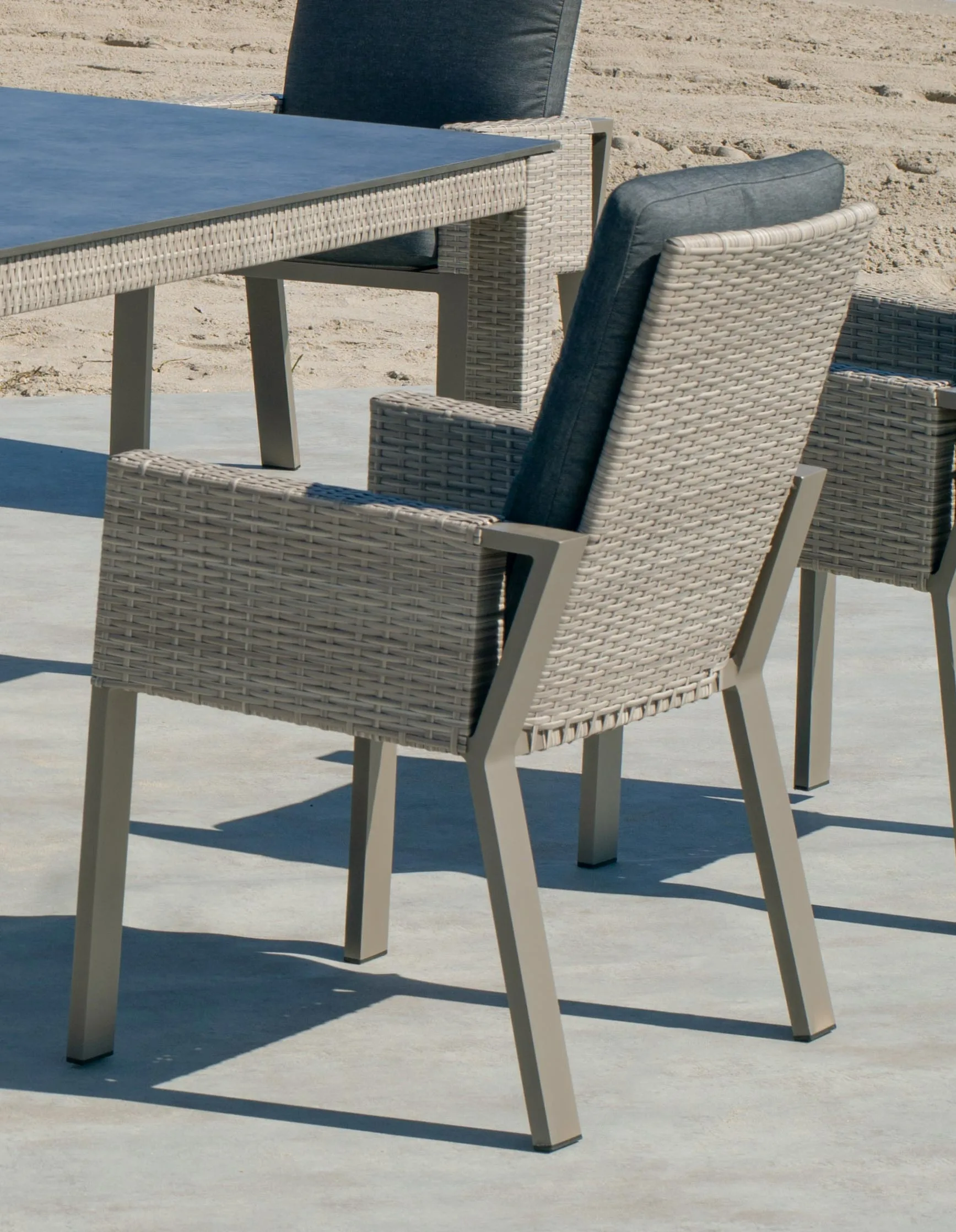 En la fabricación de esta silla, se han utilizado las mejores materias primas que la hacen muy resistente y duradera. Estructura y uniones fabricadas en aluminio extrusado de alta calidad y no reciclado. Los tubos de aluminio que la forman están perfectamente lijados para eliminar cualquier imperfección o irregularidad en las juntas. Así mismo, dichos tubos están especialmente pulidos para abrir los poros del aluminio y facilitar la fijación de la pintura. Las patas llevan tacos para evitar rallar el suelo y reducir el ruido producido con el movimiento.Esta estructura está cubierta con ratán sintético, se caracteriza por su resistencia, robustez y fácil limpieza. El ratán sintético es un material plástico de polipropileno que imita al ratán natural y que puede resistir más en el tiempo gracias a su reforzado de fibra de vidrio capaz de estar, pasados unos años, tal y como el primer día de su compra.