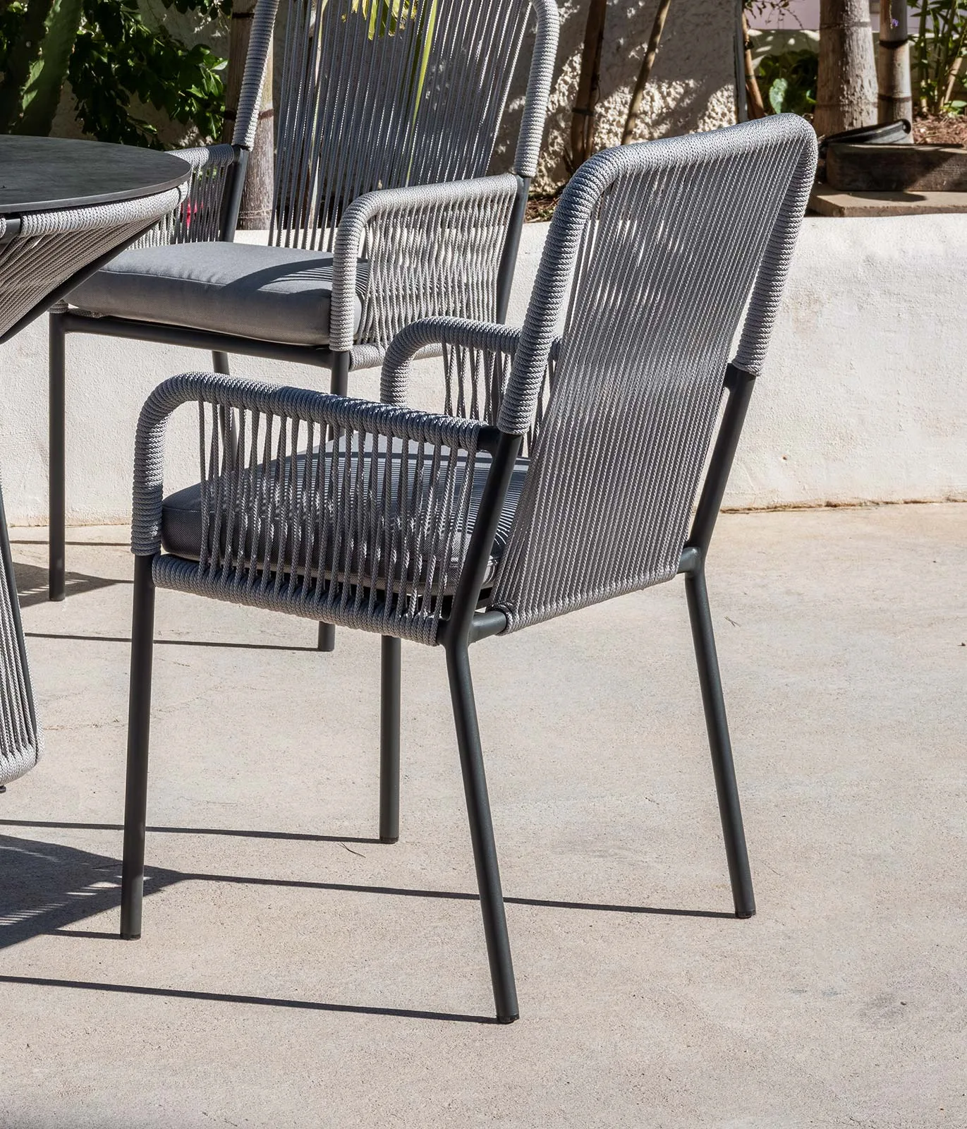 Descubre la silla de exterior moderna que redefine la elegancia: estructura de aluminio anticorrosión y asiento de cuerda trenzada UV-resistente. Con diseño ergonómico y 8 tonos de aluminio + 3 colores de cuerda, personaliza tu jardín, terraza o salón.