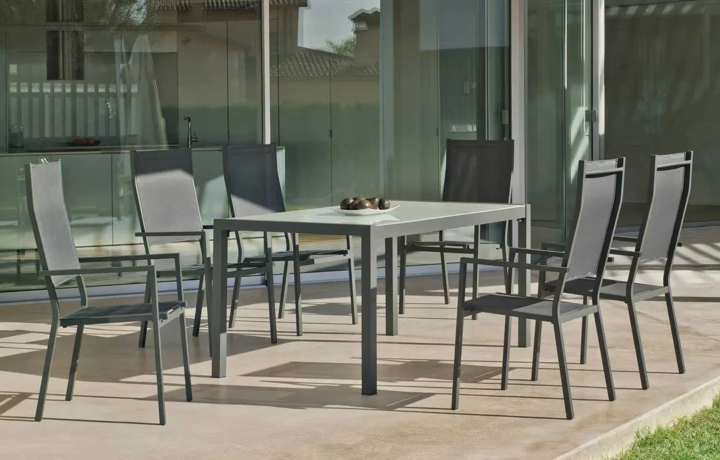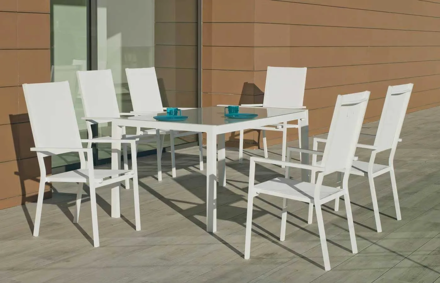 Nuestra silla de jardín de textileno tiene un limpio y original diseño, otorgan a este conjunto de exterior modernidad y elegancia. Especialmente diseñado para soportar las condiciones adversas como el sol y la lluvia, así como los rigores del uso diario. Fabricamos la estructura de aluminio en seis colores distintos; champagne, blanco, marrón, negro, plata y gris antracita.En la fabricación de este set de exterior, se han utilizado las mejores materias primas que la hacen muy resistente y duradera. Estructura y uniones fabricadas en aluminio extrusado de alta calidad y no reciclado. Los tubos de aluminio que la forman están perfectamente lijados para eliminar cualquier imperfección o irregularidad en las juntas. Así mismo, dichos tubos están especialmente pulidos para abrir los poros del aluminio y facilitar la fijación de la pintura. Las patas llevan tacos para evitar rallar el suelo y reducir el ruido producido con el movimiento.En esta silla de jardín aluminio de textilene, tanto los asientos y respaldos están fabricados con textilene, entre sus principales características destacamos: