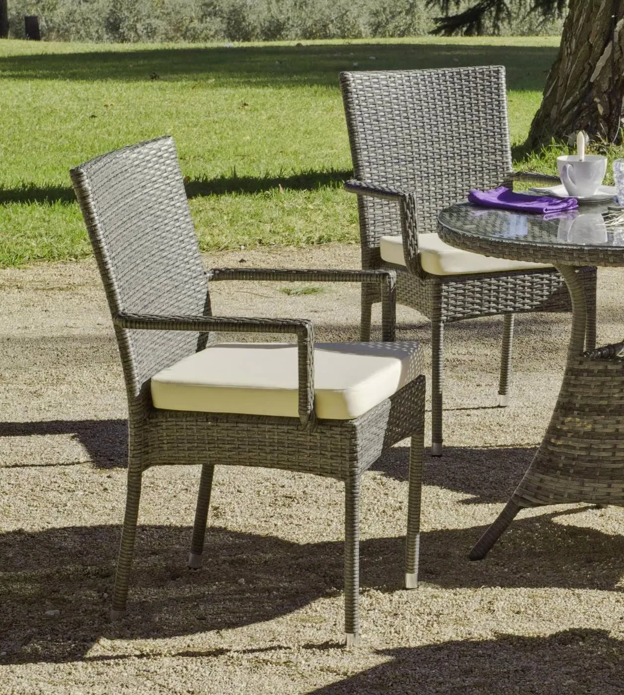 silla de ratán sintético gris con brazos podría ser una excelente opción. Esta silla combina estilo y comodidad, ofreciendo un lugar cómodo para sentarse mientras disfrutas del sol o pasas tiempo con amigos y familiares.Esta elegante silla, está