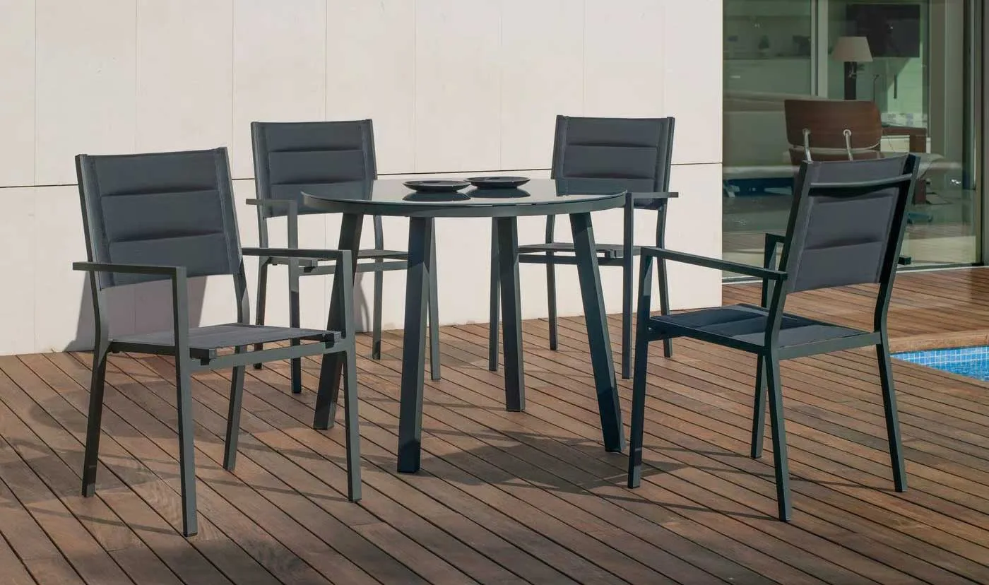 Su limpio y original diseño, otorgan a este conjunto de exterior modernidad y elegancia. Especialmente diseñado para soportar las condiciones adversas como el sol y la lluvia, así como los rigores del uso diario. Fabricamos la estructura en seis colores distintos; champagne, blanco, marrón, negro, plata y gris antracita.En la fabricación de este set de exterior, se han utilizado las mejores materias primas que la hacen muy resistente y duradera. Estructura y uniones fabricadas en aluminio extrusado de alta calidad y no reciclado. Los tubos de aluminio que la forman están perfectamente lijados para eliminar cualquier imperfección o irregularidad en las juntas. Así mismo, dichos tubos están especialmente pulidos para abrir los poros del aluminio y facilitar la fijación de la pintura. Las patas llevan tacos para evitar rallar el suelo y reducir el ruido producido con el movimiento.Los asientos y respaldos está fabricados con textileneentre sus principales características destacamos: