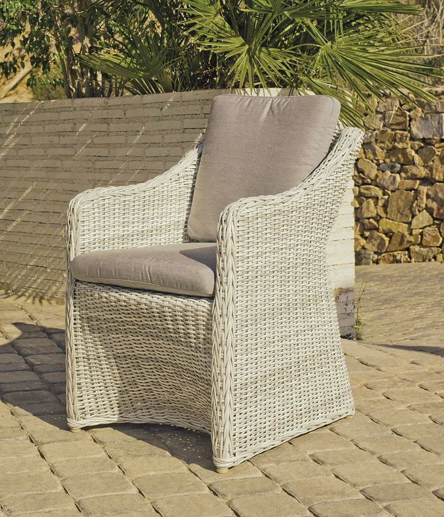 Funcional sillón de comedor de ratán sintético y cojines tapizados en tapicería Dralón modelo Celebes.En la fabricación de este sillón de gran confort se han utilizado las mejores materias primas que la hacen muy resistente y duradera. Estructura y uniones fabricadas de aluminio reforzado de gran grosor para obtener una silla resistente y de alta durabilidad. Las patas llevan tacos de PVC para evitar rallar el suelo y reducir el ruido producido con el movimiento.Esta estructura está cubierta con ratán sintético de alta calidad, se caracteriza por su resistencia y robustez y su fácil limpieza.  El ratán es un material plástico de polipropileno que imita al ratán natural y que puede resistir más en el tiempo gracias a su reforzado de fibra de vidrio capaz de estar, pasados unos años, tal y como el primer día de su compra.La tapicería está fabricada con cojines de gran confort desenfundables con tejido Dralónentre sus principales características destacamos:
