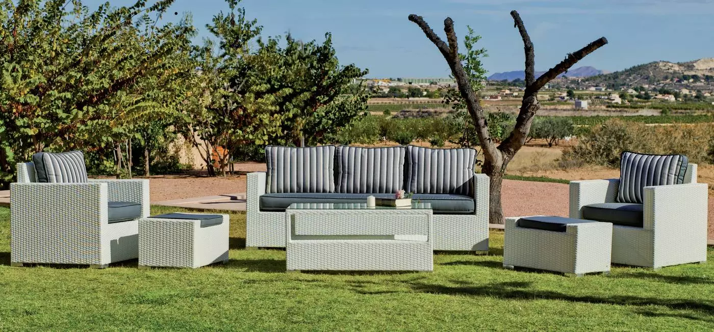 Acabo de recibir mi conjunto de jardín modelo Toscana 8 y no puedo estar más encantada con él. La calidad de los materiales es inmejorable, la cojineria es súper confortable, en un gris precioso. Repelen el agua, por lo que si te cae algún líquido, no tienes que preocuparte, puedes limpiarlo fácilmente con un paño.