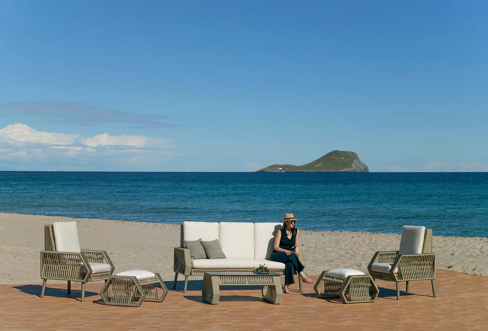 Construido para perdurar, este sofá cuenta con una sólida estructura de aluminio que garantiza resistencia y estabilidad. La cuerda náutica, conocida por su durabilidad frente a las condiciones adversas, ofrece una resistencia excepcional al desgaste y a los elementos, asegurando que tu sofá se mantenga como nuevo por años.
