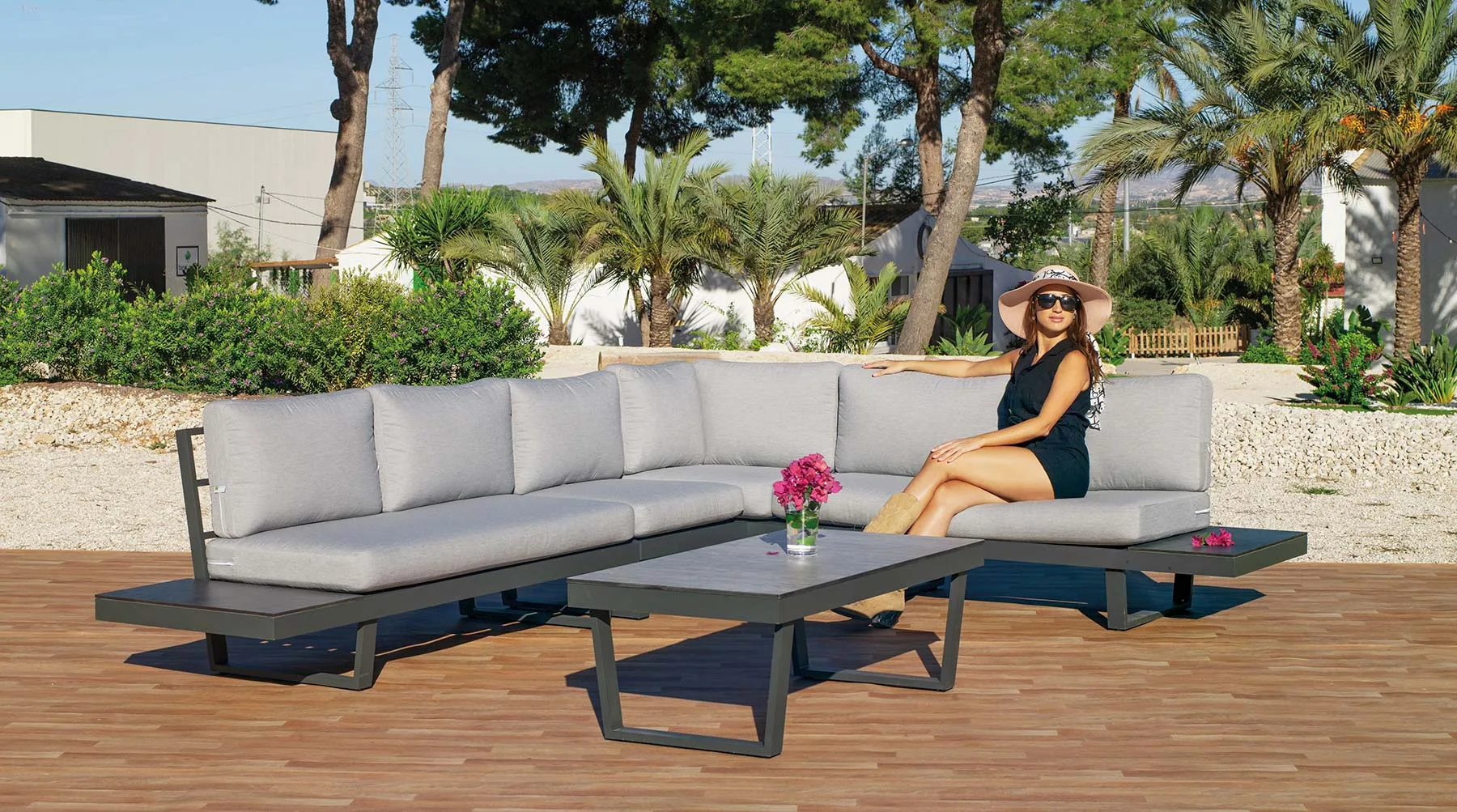 Disfruta del lujo y la comodidad al aire libre con nuestro sofá rinconera moderna para jardín. Fabricado en aluminio para resistir a los elementos, esta elegante pieza es perfecta para reuniones de hasta 6 personas.